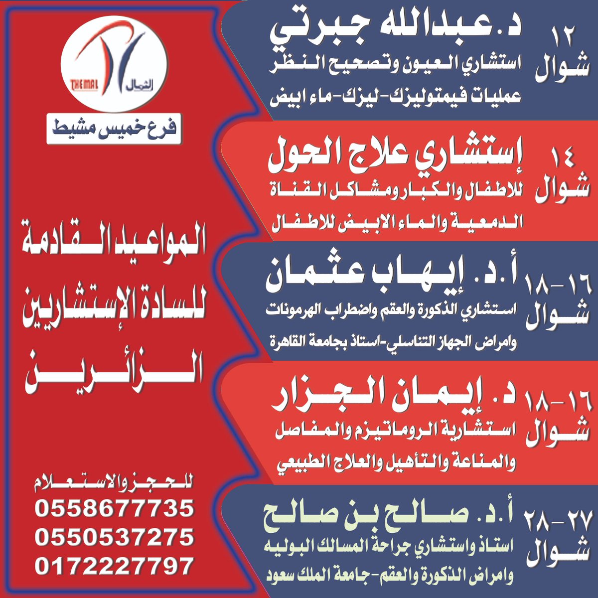 الثمال الطبي On Twitter الثمال الطبي فرع خميس مشيط مواعيد الاستشاريين الزائرين في شهر شوال للحجز والاستعلام 0558677735 0550537275 0172227797 Https T Co Uezedsdc8q