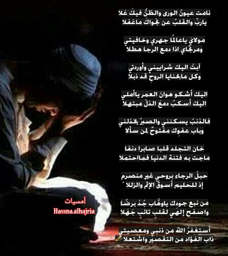 مرافئ الياسمين On Twitter نامت عيون الورى والظن فيك ع لا يارب والقلب عن نجواك ماغفلا مولاي ياعالم ا جهري وخافيتي ومرتجاي اذا دمع الرجا هطلا آبت اليك شراييني وأوردتي وكل مابحنايا الروح قد