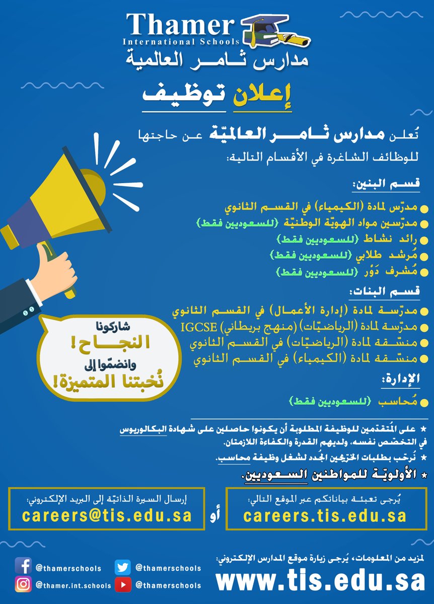 وظائف للسعوديين V Twitter وظائف ادارية و تعليمية للسعوديين و السعوديات بمدارس ثامر العالمية ب جدة التقديم عن طريق الرابط التالي Https T Co Jytwnoaoyv او إرسال السيرة الذاتية إلى البريد الإلكتروني