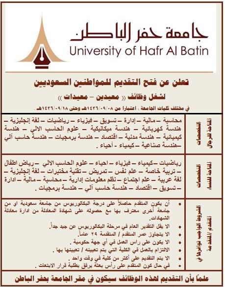جامعة حفر الباطن تعلن عن وظائف أكاديمية للسعوديين ارشيف 2017 صحيفة الوئام الالكترونية