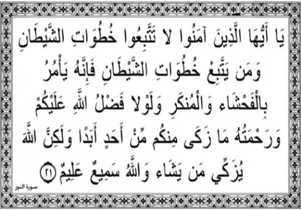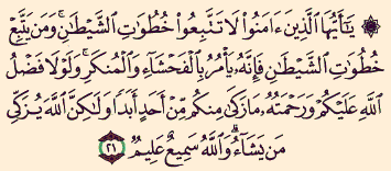 ي ا أ ي ه ا ال ذ ين آم ن وا ل ا ت ت ب ع وا خ ط و ات الش ي ط ان و م ن ي ت ب ع خ ط و ات الش ي ط ان ف إ ن ه ي أ م ر ب ال ف ح ش اء و ال م ن ك ر و ل و ل ا ف ض ل الل ه ع ل ي ك م و ر ح م ت ه م ا ز ك ى م ن ك م م ن أ ح د أ ب د ا