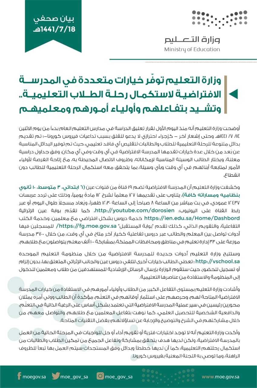 وزارة التعليم عام On Twitter وزارة التعليم توف ر خيارات متعددة في المدرسة الافتراضية لاستكمال رحلة الطلاب التعليمية وتشيد بتفاعلهم وأولياء أمورهم ومعلميهم Https T Co Qakjo6io4c